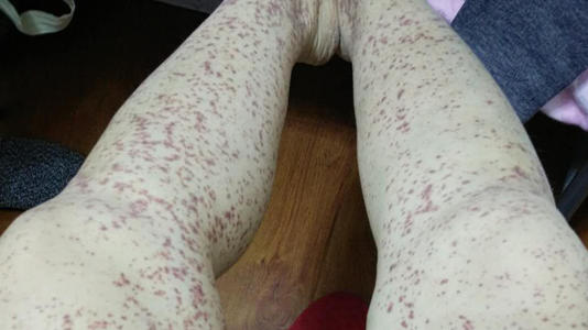 这种类型主要表现为皮肤紫癜,大小不一,可融合成片,形成瘀斑。紫癜主要发于四肢,尤其是下肢及臀部,躯干少发生,可同时伴有皮肤水肿、荨麻疹。
